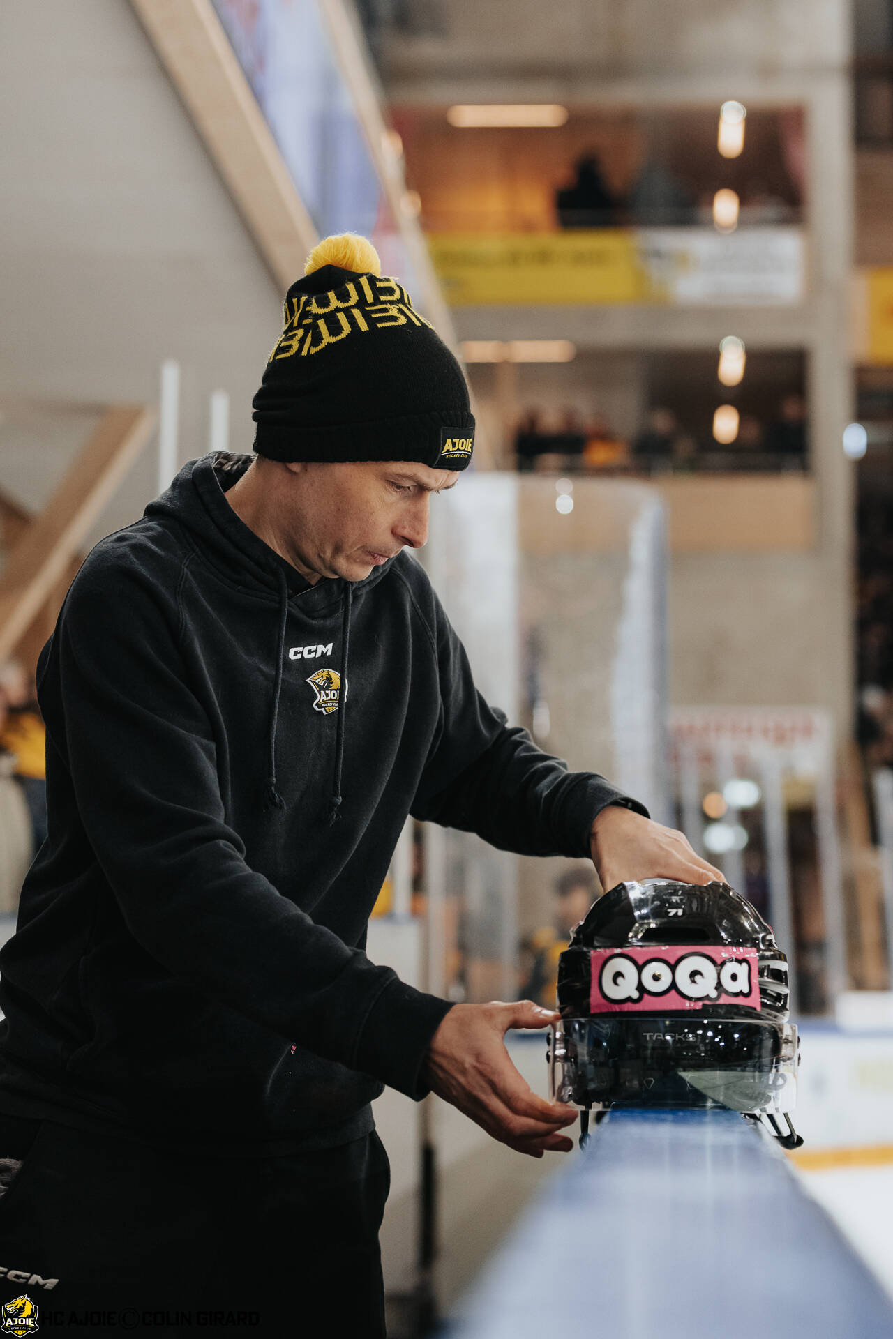 - C.G Photographie, Club National League, Colin Girard, Gellé Boris Chef Mat., HC Ajoie, HCA, HCA Vs EHCB, NL, National League, Qoqa, RAIFFEISEN ARENA, Saison25-26, Staff, avant match, casque, hockey, sponsor