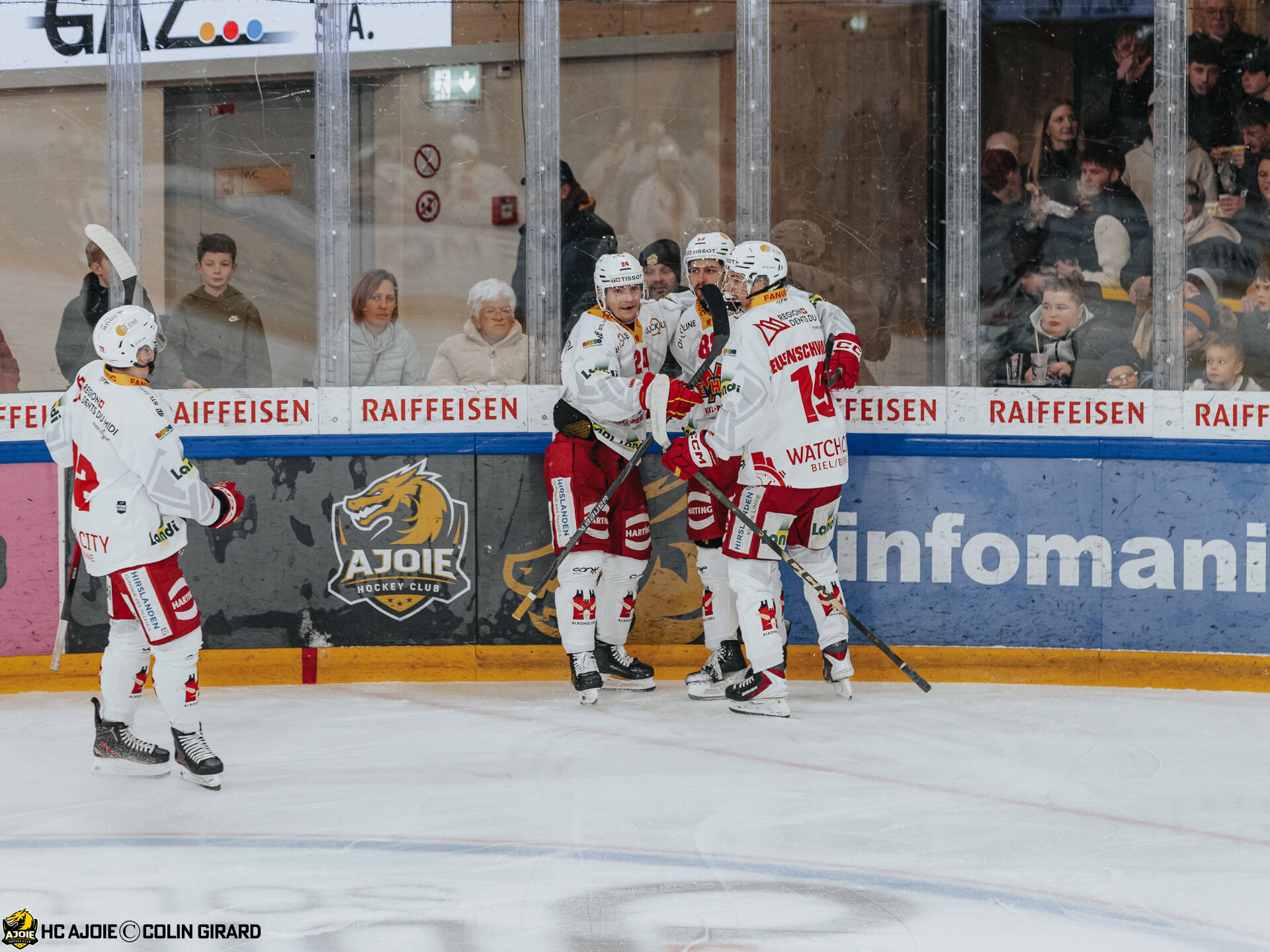 - 4 Hazen Jonathan, 8 Devos Philip-Michaël, But, C.G Photographie, Club National League, Colin Girard, HC Ajoie, HCA, HCA Vs EHCB, NL, National League, RAIFFEISEN ARENA, Saison 2025-26, Saison25-26, célébration, hockey