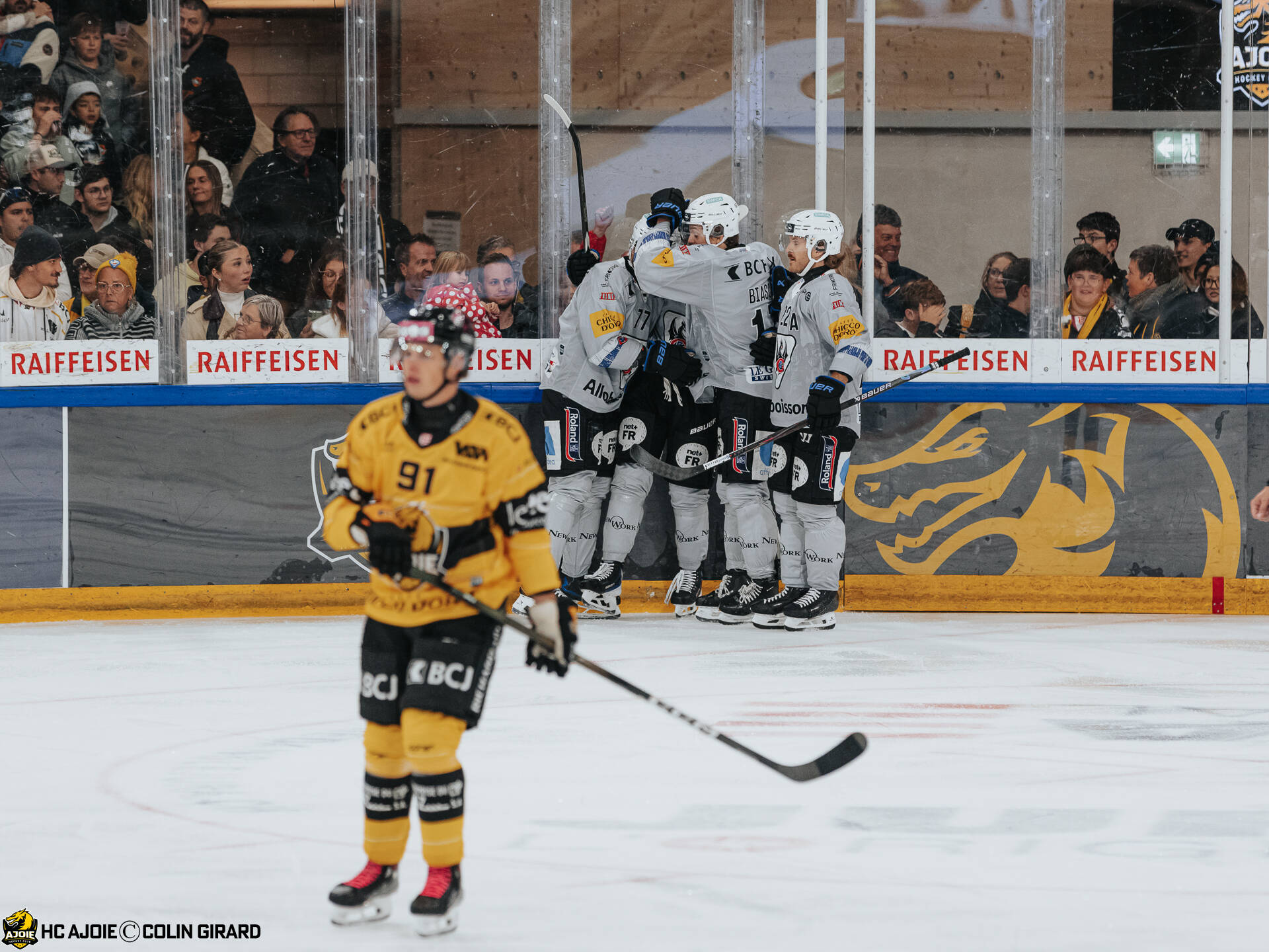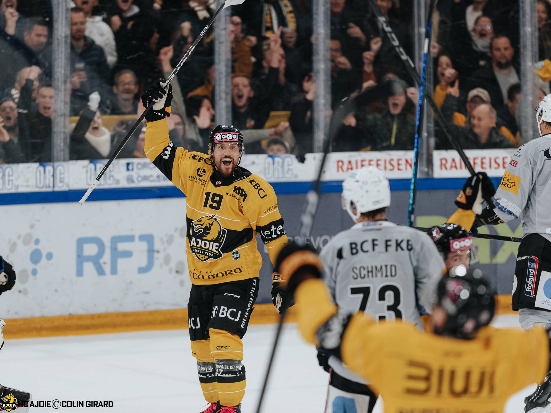 - 19 Wick Jeremy, But, C.G Photographie, Club National League, Colin Girard, HC Ajoie, HCA, NL, National League, RAIFFEISEN ARENA, Saison25-26, célébration, hockey